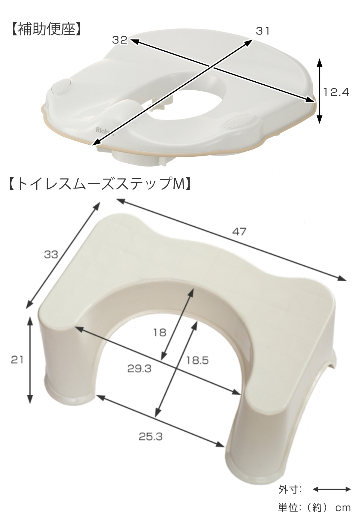 | サイズ | 【補助便座】 約 幅32×奥行31×高さ12.4(cm) 【トイレスムーズステップM】約 幅47×奥行33×高さ21(cm) |